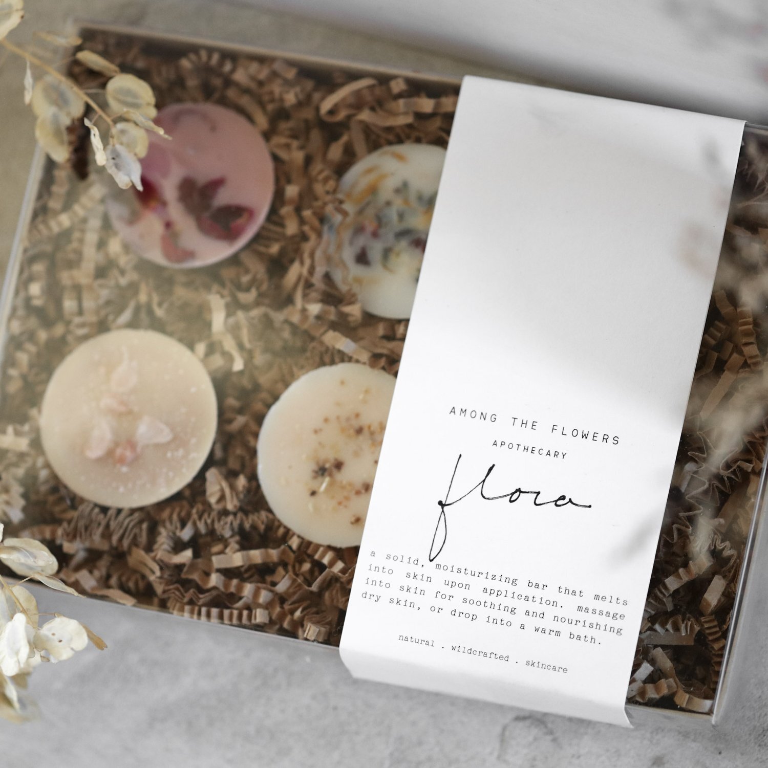 A variety of solid, moisturizing bars made to melt into the skin upon application or when added to a warm bath. Each has a different set of ingredients that are exclusively plant derived. Clays, ground flowers, nourishing oils and rich cocoa butter are the basis of these beautiful melts.